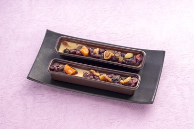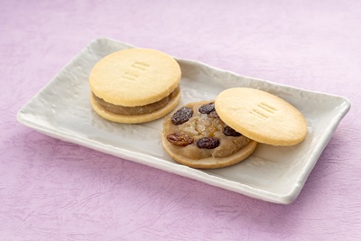 塩味をきかせたチーズサブレに、チョコと白雪大納言小豆餡を重ね、ラム酒漬けレーズンとレモンピールを合わせました。甘みと塩味、果実の香りが調和する、奥行きある味わいです。