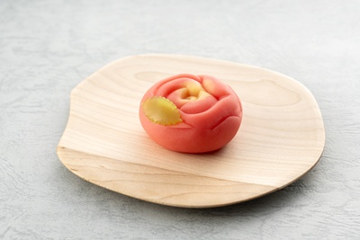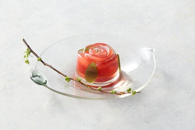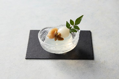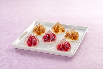 薔薇とライチを合わせた錦玉にフランボワース餡を重ねました。華やかな香りと果実の酸味が広がるみずみずしい味わいの上生菓子です。