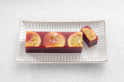 フランボワーズの羊羹にオレンジのスライスをのせて、酸味のある果実が絶妙な味わいを生み出しています。
