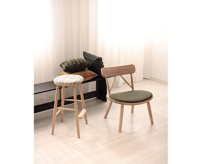 ラウンジチェアとスツールは国産ナラ材の小径木を活用したフレームに毛織物の産地・愛知「尾州」の布を纏わせました。