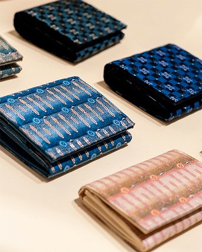 クッションやルームシューズ、財布、カードケース、ポーチ、そして空間を彩る表装まで、芸術的な素材を日常に寄り添うアイテムへと昇華させました。