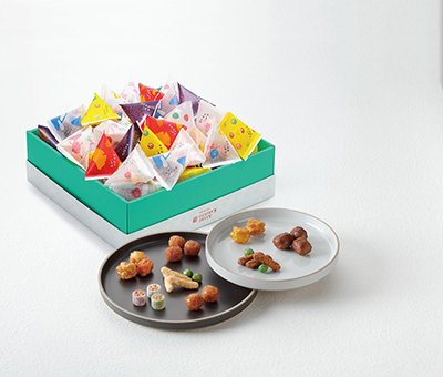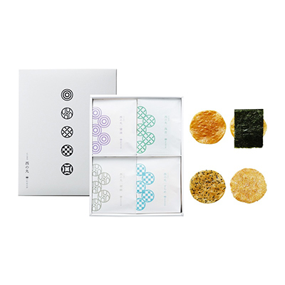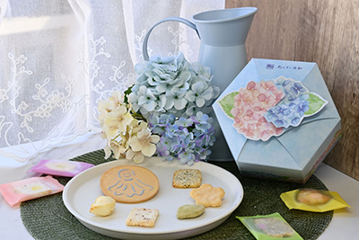 あじさいをイメージした可愛らしいパッケージに、柚子醤油や梅ざらめ、お花型の煎餅などをバラエティ豊かに詰合せました。