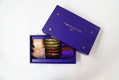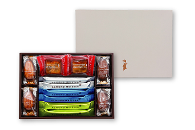 キャラメル入りショコラを自家製挽きアーモンドを使用した、ザクザク食感のアーモンドクロッカン生地でサンドしたアーモンドマイスターと瀬戸内レモンとライムを使用した季節限定フレーバー、アーモンドグラッセを練り込んだケイク・オ・マルコナ、オリジナルクリームをサンドしたアーモンドケーキを詰め合わせました。