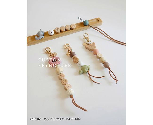お好きなシリコンパーツパーツをお選びいただき、オリジナルのキーホルダーをお作りいただけます。