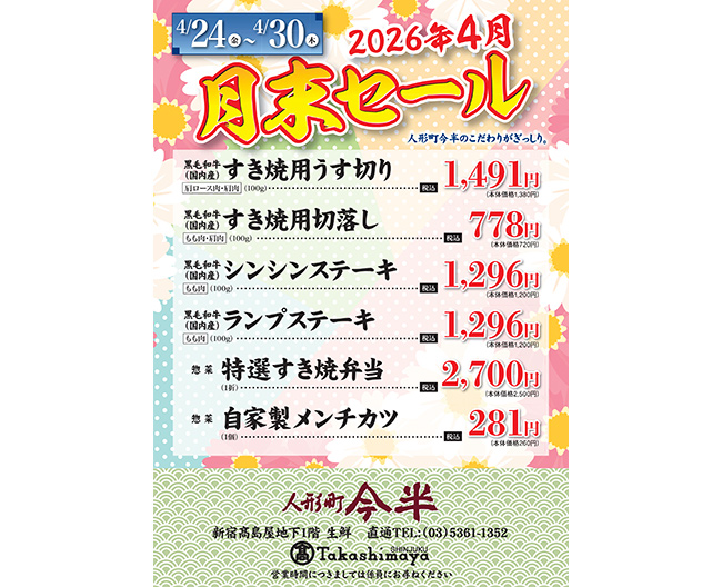 新宿高島屋 人形町今半 月末セールのご案内