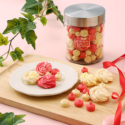 母の日限定のマカロンボーロは、白とピンクのマカロンボーロにカーネーションをイメージしたフラワーモチーフをあしらった、母の日にピッタリの可愛らしいスイーツです。