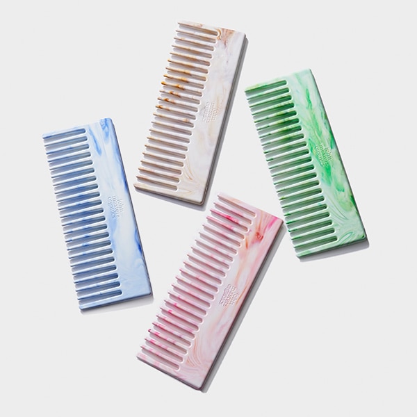 髙島屋が取り組む「デパート デ ループ」のコスメ再生プロジェクトから誕生したヘアコーム。お客様やお取引先様から回収したコスメのプラスチック素材の空容器を”色"の模様として約1割混ぜて、美しいマーブル模様に再生しました。