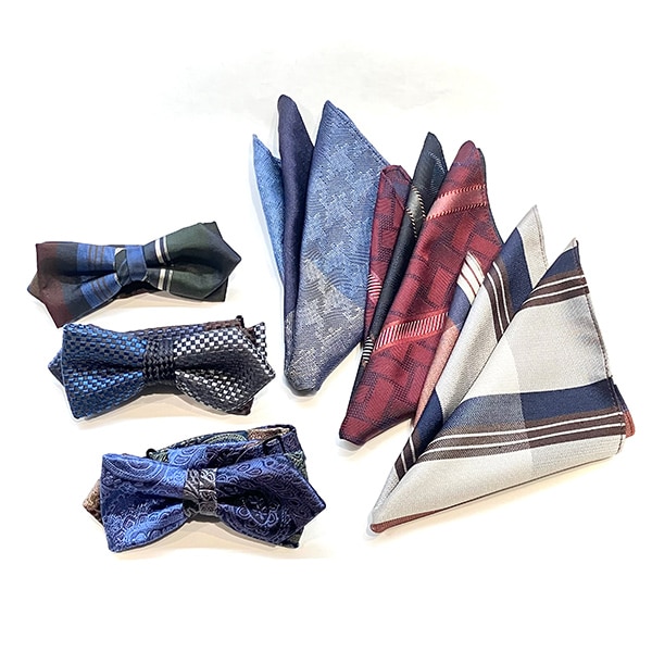 生地の色や柄を確認するために作られ、最終は廃棄される見本生地「マス生地」を利用しました。マス生地は同じものは存在しないため、アイテムは全て一点モノです。初登場のポケットチーフも合わせて、世界に一つだけのコーディネートをお楽しみください。