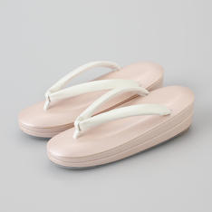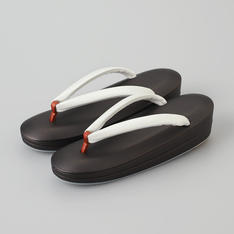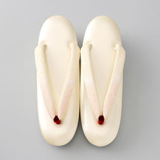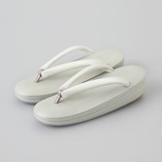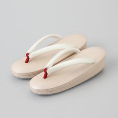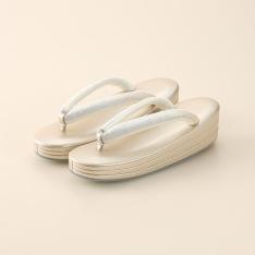 いつも安心して心地よくお履きいただける履物づくりを追求する、「創作京履物 伊と忠」。足が乗る部分に高反発のスポンジを入れているので、足の裏が疲れにくく、履きやすい商品です。花緒は、牛皮に鮫小紋の型押しをしたスリムな白花緒。足当たりを良くするために、裏にビロード生地を使用。「伊と忠」ならではのこだわりが詰まった商品です。