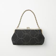 黒字に輪の刺しゅうが施された、スマートなフォルムが印象的ながま口バッグです。鎖の長さは、ハンドバッグタイプの30cmと、ショルダータイプの120cmの2種類からお選びいただけます。お洋服でも、きものスタイルでもお使いいただけます。