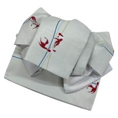 陶器の水指に範を求め、力強い鳳凰の立体感や鮮やかな色絵のツヤ感、釉薬のたまりに見られる透明感まで織の技術で表現した作品です。合わせるきものは、訪問着や付下げ、色無地など。お祝い事など華やかなシーンに好適です。