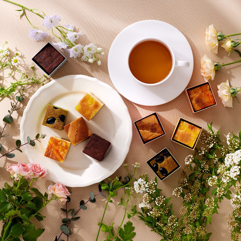 可愛いキューブ型のパウンドケーキ。おいしさ長持ちの個包装で、積み木を思わせる手のひらサイズのボックスに収めました。贈答品から自分へのご褒美までどのようなシチュエーションにもピッタリです。