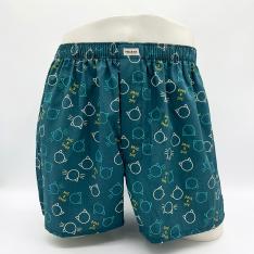 猫をかたどったサークルモチーフを幾何柄風にアレンジした可愛いトランクス。4枚剥ぎのおしりにゆとりを持たせた立体的なパターンを採用。足口スリット入りで余計な突っ張り感を軽減。ショートパンツとしても穿けるファッション性の高いスタイル感。