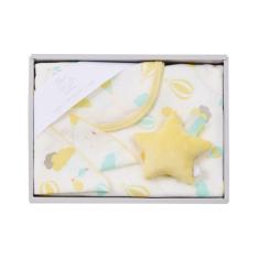 【スタイ】かわいいくま柄のやわらかな六重ガーゼで、よだれをしっかり吸収します。 何枚あっても便利なスタイは、出産準備の必需品。プレゼントにも喜ばれる人気アイテムです。 スタイの裏側には、めくれて顔にかかる事を防止する紐が付いています。中央で切るか、そのまま結んでお使いください。【ガーゼハンカチ】沐浴の際に、授乳の時に、お食事の時にさっと使えるガーゼハンカチです。二重ガーゼを使用しているので、使うほどに柔らかくなります。【ソックス】足首に並んだくまさんがかわいらしいデザインのソックスです。伸縮性のある生地で赤ちゃんの脚をやさしく包みます。【ガラガラ】振ると優しい音がするガラガラ。布製なのでなめても安心なおもちゃです。