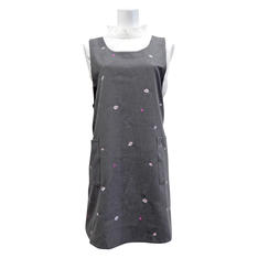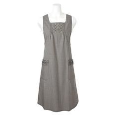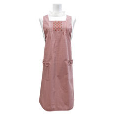 胸元の規則的で繊細な小花刺しゅうと両脇のタックがおとなの可愛らしいムードを演出。ポケットの入口のフリルが腰回りにふわっとボリュームを与えます。糸を先に染めてから織り上げる先染めギンガムチェック生地は、色合いや風合いがお洗濯しても変わりにくく、長くご愛用いただけます。後ろのリボンでウエストサイズを調整できます。
