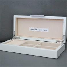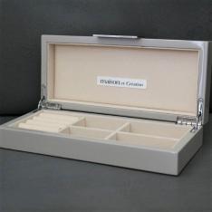 シンプルなジュエリーボックスはエナメルの艶が美しい、スタイリッシュで上品な印象の佇まい。中は仕切りがあり指輪やピアスネックスレスの収納可能です。ギフトに大変人気のシリーズです。「シフォン(グレージュ)×シルバー」と「ホワイト×シルバー」の2色をご用意しました。