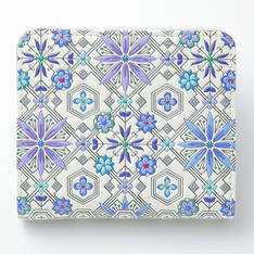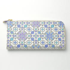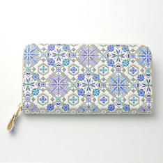 播州姫路の真っ白になめした牛革に、型友禅と手描き友禅の技法を使って一つひとつ手作りしました。色を重ねることで表情のある鮮やかな濃淡が生まれます。さらに加熱した凹凸金型で、約100トンの圧力をかけることで柄がより立体的に浮き立ちます。四季折々の縁起がよい草花を図案化し、シャープな直線と規則性のある曲線で構成しています。また、中央にカード入れがあり、交通カードを入れてそのままご使用いただけます。コンパクトながら機能的な財布です。