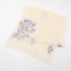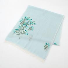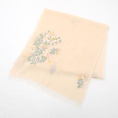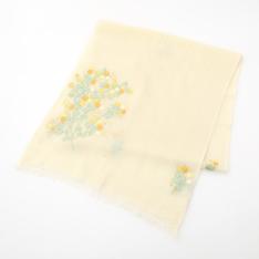 ミモザの花束をイメージしたモチーフの手刺しゅうストールです。巻いた時に上品な可愛らしさを演出し、首元に巻いても、羽織って使用しても素敵で優しいイメージになります。