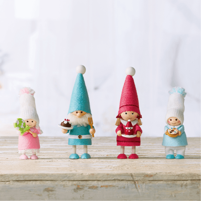 サンタさんもちょっとひとやすみ。白い「サイレントナイトシリーズ」は、静かな冬の夜をモチーフにしています。北欧インテリアとの相性もよく、クリスマスシーズンが過ぎた後も、長く飾れるのが人気のポイントです。<ノルディカニッセ>は、Nordika Design(ノルディカデザイン)社が手掛けるハンドメイドの木製人形ブランドです。デンマークの妖精ニッセ をモチーフにした人形をつくり、世界に幸福を届けています。ニッセは古来より、子どもたちや家を守り、クリスマス時期にはサンタクロースのお手伝いをすると言われている北欧の妖精です。いたずら好きで働き者のニッセが住む家には幸福が訪れると考えられ、デンマークで長く愛されています。