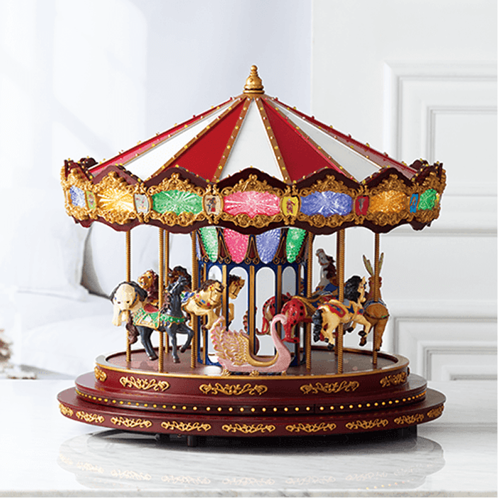 アンティークの彫刻のようなデザインで、電源を入れるとライトが点灯し、オルゴールの音色とともにクリスマスの雰囲気を盛り上げてくれるアイテム。ドームを振るとキラキラ雪が舞ってドームの中は幻想的な世界に。ずっと見ていたくなる、心温まるアイテムです。