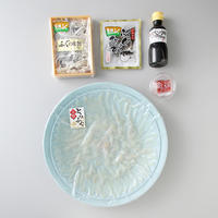 とらふぐ刺身150g(33cm陶器皿盛)、とらふぐ皮刺150g、とらふぐヒレ5g、ふぐしょうゆ(ポン酢)150ml、もみじおろし3g×8