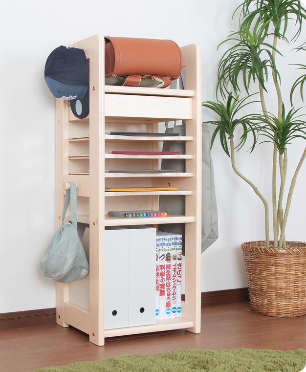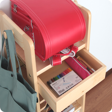 木目が美しい天然の北欧パイン材を使用。子どもらしい丸みのあるデザインで、年月と共に、味わい深い色合いになっていきます。「ここに置く」と決める場所があることで、整理が楽になるだけでなく、通学準備もスムーズに!