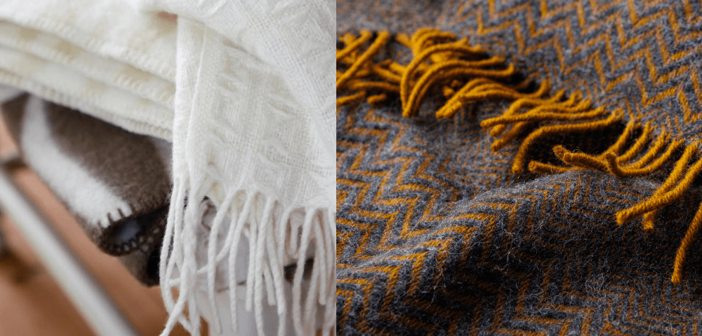 ・織り方:スローは経糸と緯糸をふんわりと織り、空気をたっぷり含みます。ブランケットは毛糸をしっかり詰めて追っているので防寒機能に適しています。