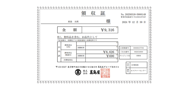 会社でお歳暮を贈る場合や、経費で落とす必要がある場合などは領収証が必要になることもあります。高島屋オンラインストアでは購入後に自分で領収証を発行することが可能です。注文した商品の決済完了後、マイページの購入履歴から「領収証発行」の操作を行えば、領収書をダウンロードできます。