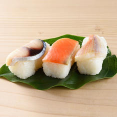 紀州には全国に名産と知られる「南高梅」があります。この南高梅を隠し味に独自の味わいに仕上げました。魚は国産の鯖・鯛を使用。シャリは、艶やかなすし飯に仕上げ、一つ一つ丁寧にあせの葉(イネ科)で包みました。
