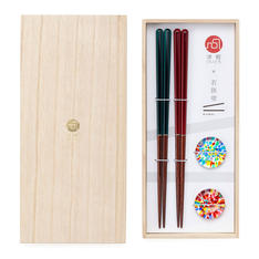 可愛らしい津軽びいどろの箸置と若狭塗のお箸二膳をあわせました。木箱入りで贈答に好適です。箸置きは花火のパッと広がる光の粒や、やがて消えゆく儚さなど、その美しい一瞬の煌めきを多彩な色ガラスを使って表現しました。お箸は家庭用食器洗浄機使用可能です。