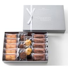 ガトーショコラのような濃厚な味わいのフィナンシェショコラ、アーモンドプードルの風味豊かなフィナンシェナチュールの2種類のフィナンシェと、濃厚なショコラの味わいのサブレショコラ、ゲランド塩を利かせたサブレゲランドの2種類のサブレの詰め合わせ。