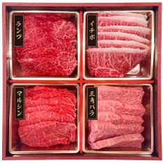 肉質はきめ細やかで、輝くようなつやがあり見栄えもいいロース肉と、濃厚な味わいと鮮やかな霜降りが特徴のバラ肉を、焼肉用にカットしました。木箱に詰めてお届けいたします。
