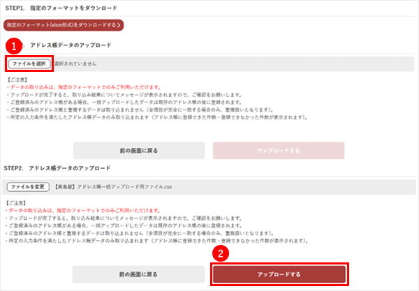 3-1.作成済みのアドレス帳データを選択してアップロードしてください。