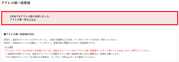 3-2.アップロードが完了すると、取り込み結果についてメッセージが表示されます。内容をご確認のうえ、修正が必要な場合はエクセルファイルで再度入力・アップロードいただくか、マイページのアドレス帳編集画面にて修正してください。