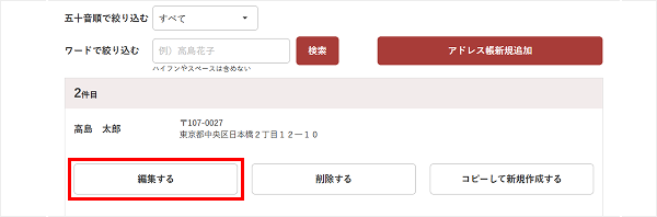 修正したいお届け先の下に表示されている「編集する」ボタンより変更いただけます。