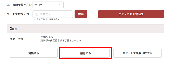 削除したいお届け先の下に表示されている「削除する」ボタンより削除いただけます。