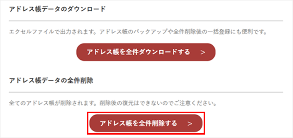 お届け先一覧の下に表示されている「アドレス帳を全件削除する」ボタンより削除いただけます。