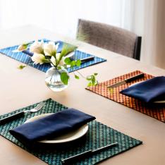 「明日うまれる、日本の伝統」を掲げるYASIMA。この商品は京都の西陣織に印伝技法で漆を施した独自素材の、食卓やコーナーテーブルを美しく演出するプレースマットです。最大の特徴は、絹糸の繊細な光沢と漆の艶やかな立体感が生み出すコントラスト。表面だけでなく裏面まで西陣織100%で仕立てた高級で贅沢な仕様です。また、両面に防汚・撥水加工を施しており、繊細な美しさはそのままに、日々の食卓で気兼ねなくお使いいただける実用性を備えました。国内の専門工場が洗練された仕上がりを実現しました。漆特有のしっとり感は、触れるたびに五感で楽しむことのできるアートのような仕上がりになっています。