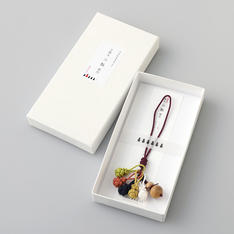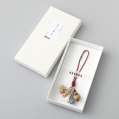瓢箪をかたどった5色の正絹製の組紐に白檀玉の瓢箪を組み合わせた根付です。「三つそろって三拍(瓢)子、六つそろって無病(六瓢)息災」といわれている縁起物です。健康長寿や息災の願いを込めた贈りものとしてもおすすめです。