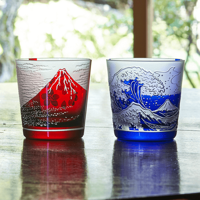 葛飾北斎の富嶽三十六景の「凱旋快晴」「神奈川沖波裏」をモチーフに、熟練した職人が丹精を込め一つ一つ彫刻しております。冷酒グラス等に最適です。ご進物、海外のお土産にも喜ばれるお品です。