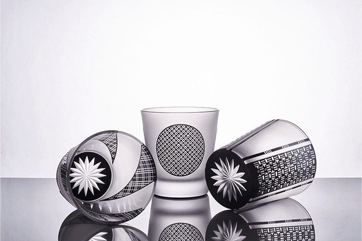 彫刻夢柄子は、二層の色被せ硝子を一つ一つ手吹きにて作り、その器にサンドブラストの技法を使って彫刻を手作業でほどこし、二色のコントラストで図柄を表現しています。