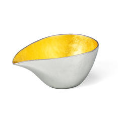 日本酒が映える金箔貼りの片口。富山県高岡市の伝統産業である「鋳物」の技術をもとに製造しています。錫は熱伝導率が高いので、事前に1~2分冷蔵庫に入れておくと、よく冷えた状態でご使用いただけます。ドレッシング入れや食器としても、また、ワインをお楽しみいただくなどご自由にお使いください。金沢の伝統である金箔とのコラボ商品。約365cc(満水容量)入ります。ご自宅用にはもちろん、化粧箱入りなので、大切な方への贈りものにもおすすめです。