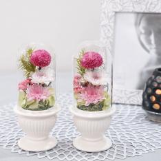 丸いフォルムが可愛らしく、ピンクの濃淡がエレガントで華やかな印象のバラのアートフラワーポプリアレンジメントです。花器の中には香りのついたポプリが入っていて、ふんわりと優しく広がる香りに癒されます。