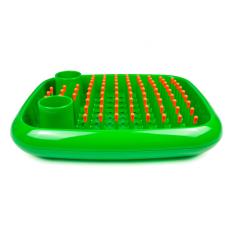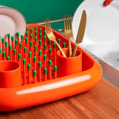 キッチンに映える斬新なデザインの水切りラック。縦横に配列された突起により、無造作にお皿を立てかけられます。中央になるほど突起が長くなっているので、大きめのお皿にも対応できます。円筒形のカトラリーホルダー付きで、とても機能的。トレイは取り外しができ、丸洗いが可能です。