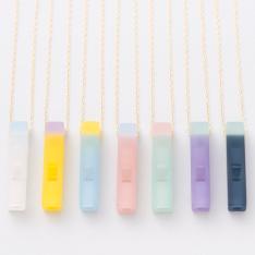 「いつも」と「もしも」がひとつになった、笛のアクセサリー<effe>。色の組み合わせがきれいな2色を組み合わせたキャンディーシリーズ。人の耳に聞こえやすい2kHz~5kHzの音の中で、がれきの下からでも遠くまで響く高音域4kHzを中心に音が鳴り、また救助犬への聞こえやすさも配慮しつつ、12kHz・16kHz・20kHzの音がきれいな層をなすよう作っています。※音の大きさは5秒間の平均騒音測定で85dB以上鳴ります。(福井県工場試験場指導のもと測定。一般的に、60dB以上で人がうるさく感じる大きさといわれています)