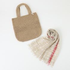 【トートバッグ】日常で使えるシーンは多く、お買い物用バッグや普段持ち歩くバッグなどとしてもマルチに使えるトートバッグ。丈夫なポリプロピレンの糸を使って手編みしました。A4サイズのものも収納できるゆとりのある大きさ。洗濯ネットに入れて洗濯機で丸洗いOK。【リネンコットンストール】リネンと綿の小幅のストールです。日本の昔ながらの小幅織機で時間をかけてゆっくり織っているため、ソフトでリネンのしなやかさも持ち合わせています。両端はミミがあり無縫製なので首回りにあたる部分がソフトです。リネン独特のシャリ感とボリュームがなくなりにくく使いやすいストールです。