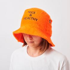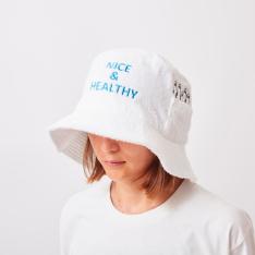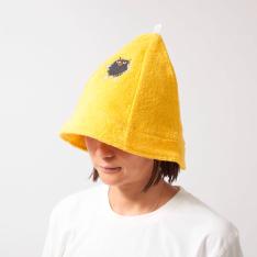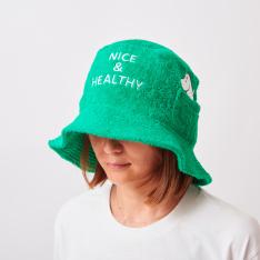 パイル素材で作られたバケットハット型のサウナハット。サウナハットはサウナ室の熱から髪や頭皮、耳を保護してくれます。フロントにはNICE&HEALTHYの刺しゅう、左側にはムーミンの刺しゅうがポケットから覗く愛らしいデザイン。ポケットの中には鍵やアクセサリーを引っ掛けられる便利なループが付いています。深く被れるサイズ感のため、サウナ室で視界を遮り瞑想したい方にもおすすめです。使用後に濡れたままでも入れられる専用のクリアポーチ付きです。