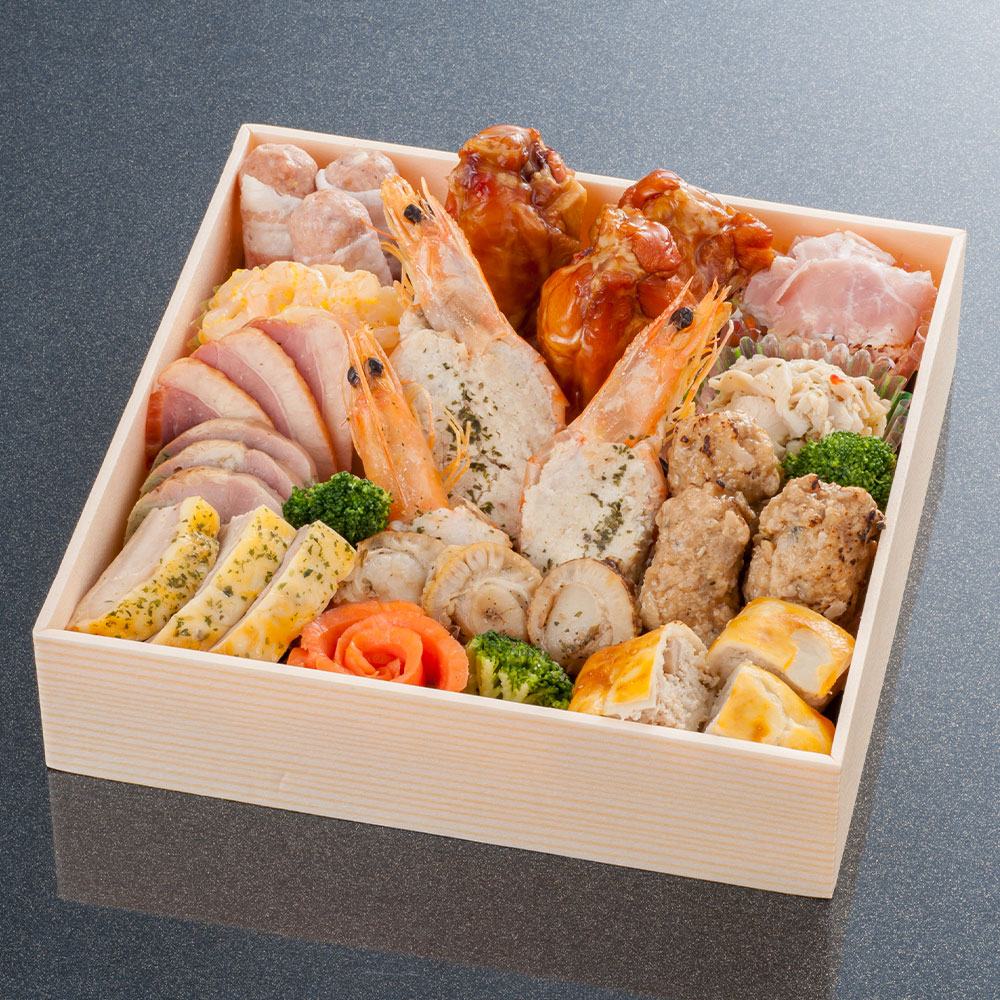 【一の重】ベーコンチーズドック、ぷちぷり海老サラダ、手羽元スモーク、パストラミベーコン、桜島どりマリネチキン、合鴨スモーク、ほうれん草と若鶏のテリーヌ、鶏チーズ焼、開き海老ポルチーニ風味、帆立香草焼、スモークトラウトサーモンローズ、鶏つくね、鶏のポルチーニパイ包み、味付ブロッコリー