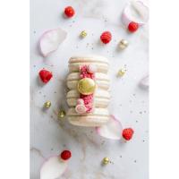 ローズとフランボワーズのクルスティヨンにバラが香るシャンティ・マスカルポーネ、アーモンドコンカッセ入りのビスキュイ・ジョコンド・ローズ、フランボワーズとライチのコンフィを重ね、バニラが香るホワイトチョコレートでコート。シュトロイゼル・ローズとミニマカロン・シェル・ローズ、金箔のマカロン・シェルのデコレーション。