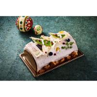 ヘーゼルナッツ生地に柚子チーズクリーム、ソテーしたパインとバナナ、マンゴーを巻き込んだロールケーキ。チーズクランブルとチョコのクリスマスツリーを華やかに飾りました。
